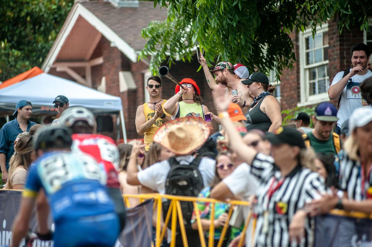 Austin Navrkal blows a horn outside a house on Cry Baby Hill during the Tulsa Tough Races in Tulsa on Sunday June 9 2019. A series of bicycle rides and races over three days that includes everything from a Townie Ride of a few miles to long distance rides and everybodys favorite the Criterium Races which are short races on a closed loop of multiple laps. One of the huge sports events in Tulsa is Tulsa Tough.